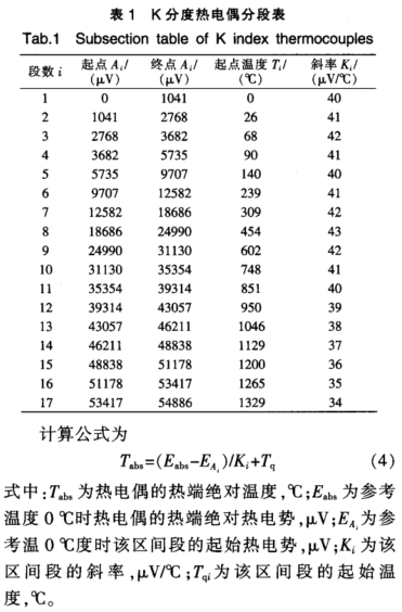 假設采用式(2)實現冷端補償后的K分度熱電.偶的熱電勢為41859μV,顯然該值落在第12分段.,區間,其初始溫度值為950℃,斜率39μV/℃,該區間段的起始熱電勢為39314μV,根據式(4)可得實際溫度值為Tabs=(41859--39314)/39+950=1015.3℃。
