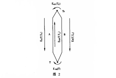 在熱電偶回路中,兩電極接觸有接觸電勢EAB(T)和EAB(T0),A和B間有溫差電勢EA(T,T0)和EB(T,T0),當T>T0時,則各電勢的方向如圖2所示。