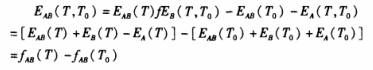 此式表示出了熱電偶的熱電勢與溫度的關系。如果使參考端溫度恒定,則ƒAB(T0)為常數,于是回路熱電勢EAB(T,T0)就只與溫度T有關,而且T是單值函數,這就是應用熱電偶測溫的基本原理。