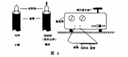 對熱電偶測量端接頭的焊接工藝應加以足夠的重視,接點焊點質量的好壞將會對測量結果帶來直接影響。較常見的有斷路、熱電勢不穩和寄生電勢的產生等干擾的存在,因此要求焊點不僅要焊牢,而且要光滑,不得有砂眼和裂紋。另外,為減少傳熱誤差和動態響應誤差對測量結果帶來的影響,還須注意,焊點的直徑要盡量小,通常為熱電極直徑的2-3倍(即:1-1.5mm左右),在低溫測量中更應注意,將被焊的熱電極接電源正極,碳棒端接電源負極,以避免熱電偶測量的滲碳現象。對于標準熱電偶來說,一般采用點焊,要求熱電極絲不能扭結,焊接電壓由調壓器控制,要保證焊點光滑、且大小適中。正確的熱電偶焊接法如圖6所示。