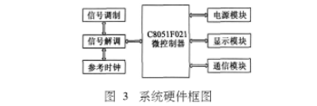 硬件主要包括了C8051F021主控模塊、信號調制解調模塊、電源模塊,串口通信模塊及顯示模塊。系統硬件框圖如圖3所示。