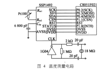 測溫原理已在第1.2小節給出,其核心電路如圖4所示。由于SSP1492能接受的振蕩器頻率在1MHz內,而PT100溫度傳感器的電阻值約為1002,所以選用6800pF的固定電容即可構成滿足要求的RC振蕩器。SSP1492下方的是計數參考時鐘電路,該電路能產生18MHz的時鐘信號,用于頻率信號解調計數器觸發的時鐘基準。