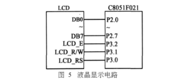 C8051F021沒有集成液晶驅動模塊,所以測溫儀選用GXM1602C點陣式字符液晶顯示器模塊來顯示測量到的溫度值和計數值等信息,該液晶模塊與微處理器間的連接較簡單,操作方便。電路連接如圖5所示。