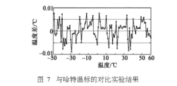 在上述條件下,同時用兩種測溫儀采集了從-50~+60℃之間的各個整數溫度值,進行差值后的數據如圖7所示。由圖可看出,在溫度范圍中與1560型Hart溫標相比,測溫儀的絕大多數溫差在±0.1℃范圍內,兩者具有較高的吻合度。