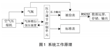 工作原理為:使用空氣壓縮機或者氣壓泵進行壓力輸出,經三通后分為兩路輸出,-.路給氣瓶充氣,一路經壓力保壓裝置后,進人壓力調節控制裝置,經穩壓后輸出差壓壓力,標準變送器與被檢變送器同時測量該差壓值,標準變送器通過RS232通訊端口將測試數據傳輸到后臺軟件里進行記錄.計算.儲存后進行輸出和打印(見圖1)。