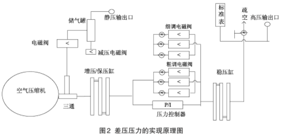 被撿差壓變送器靜壓端安裝于圖中的靜壓輸出口上,高壓端安裝于圖中的高壓輸出口上。空氣壓縮機通過接人三通將其回路分為兩路,一路負責靜壓輸出口的壓力輸出,一路負責高壓輸出口的壓力輸出。當空氣壓縮機開啟時,靜壓回路通過調節電磁閥給儲氣罐充氣,儲氣罐另一端的減壓電磁閥用于調節靜壓輸出口的壓力輸出。而高壓輸出回路,原理是:將空氣壓縮機提供的壓力通過增壓/保壓缸將壓力增壓后,經過壓力控制器調節粗調電磁閥及細調電磁閥后輸出到穩壓缸穩壓,再經穩壓缸輸出,保證其壓力的穩定可靠。