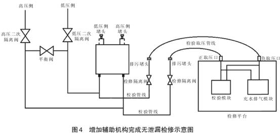 在不拆除儀表管線的情況下,通過設(shè)置檢修接口或者輔助結(jié)構(gòu),實現(xiàn)了檢修平臺與差壓變送器高、低壓側(cè)密封連接,再通過連接檢驗取壓管線完成介質(zhì)導(dǎo)出或者充入以及校驗壓力的給入,實現(xiàn)了變送器檢修過程的無泄漏控制。