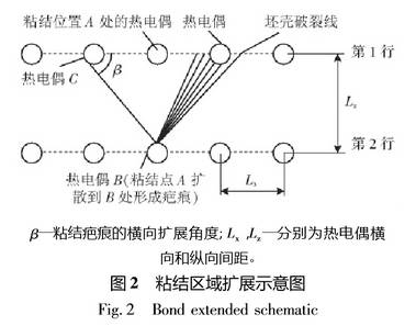 設熱電偶A處為粘結點產生的位置該粘結點同時向下方和左右擴散。tz為粘結點從位置A縱向擴散到熱電偶B處所需時間;tx為粘結點從位置A橫向擴散到熱電偶C處所需時間;V,為粘結點的縱向擴散速度;Vx為粘結點的橫向擴散速度;V為拉速。熱電偶布置的原則是期望縱向熱電偶組(A與B)和橫向熱電偶組(A與C)同時判斷出漏鋼事故即tz=tx則有