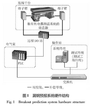 漏鋼預報系統主要由熱電偶測溫系統、端子箱、遠程I/0站、PLC、交換機、測試終端和系統終端組成硬件結構如圖1所示。